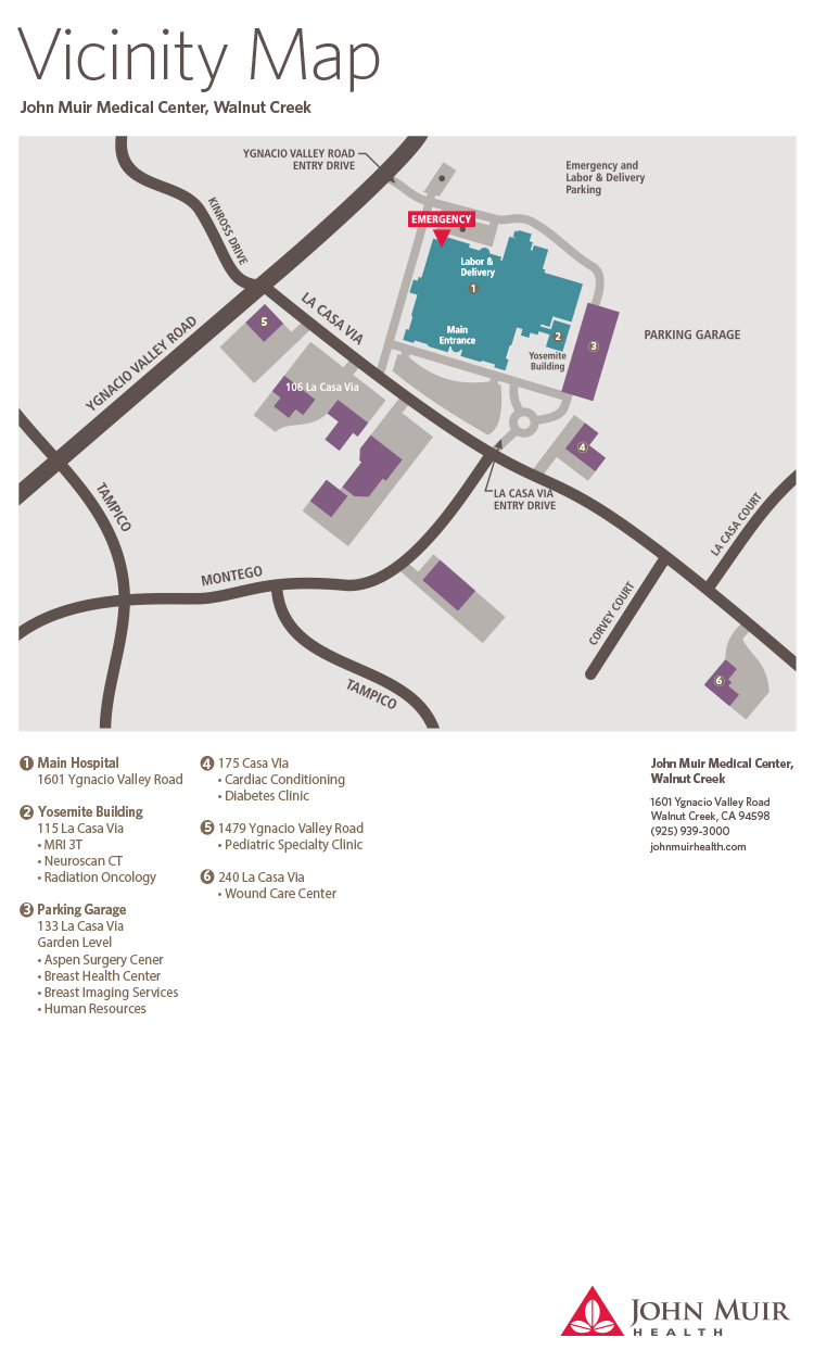 We are located beneath the John Muir Medical Center, Walnut Creek parking garage on the Garden Level. It is easiest to access our center from the elevators located in the middle of the parking garage. There is designated parking for Aspen patients on Level 4.